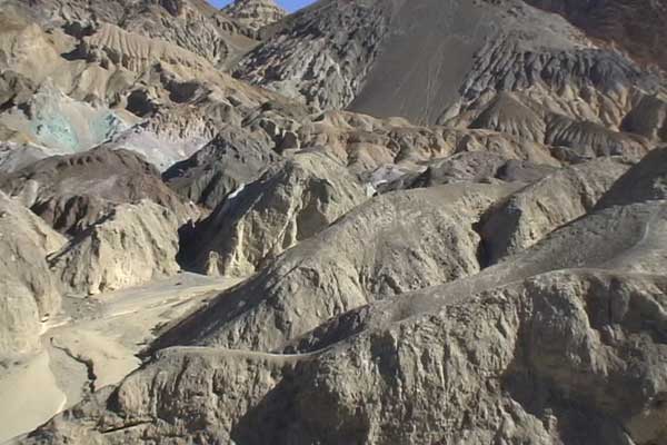 Badwater is the lowest point in the Western Hemisphere, about 282 feet below sea level, with signs and appropriate landmarks denoting the area. It is an eye opener to see the beige and ochre hills in the distance and then an even white sheet covering a valley that goes on as far as the eye can see. The whiteness is actually salt from a dried lake, and you can walk out into the lake bed.