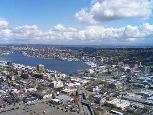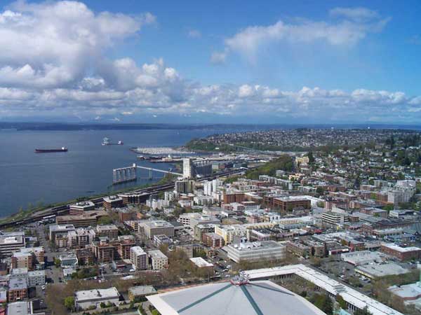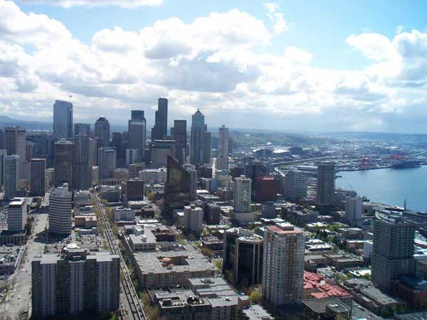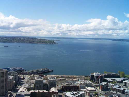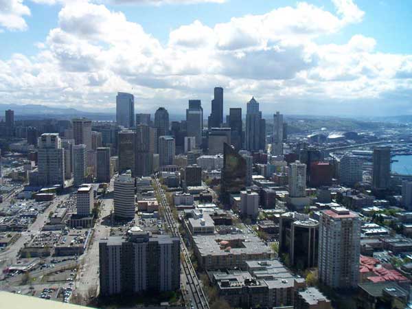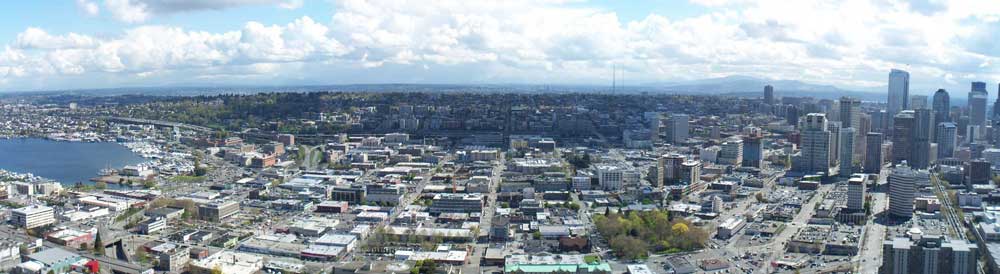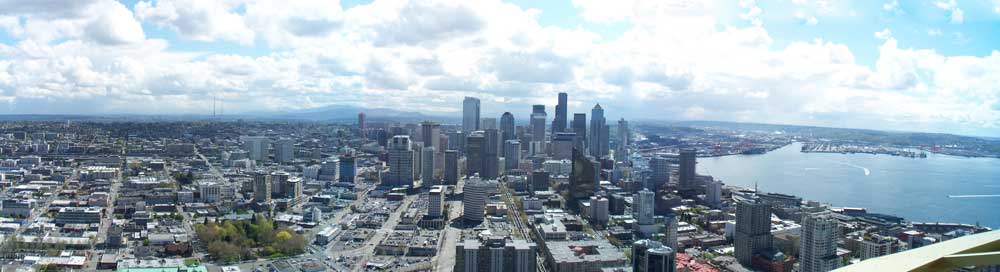 We arrived in Seattle late in the evening, due to delays at the border crossing. I finally met Leslie and Sarah after an almost 3 year hiatus. I handed Leslie my DVD’s, a tribute to his inspiring short films. They graciously hosted me and Appa drove onwards to Pete’s house south of Seattle. That night we saw the Himalayas DVD and I helped Babu (Leslie) fix his computer. Actually I didn’t do anything, I just sat down and the computer came back to life, honest. The next day I talked with Sarah as she made me delicious apple pancakes with cashew butter and Chyavan Prash. She took me on a tour of her Ayurvedic studio where she gave consultations and treatments. Then she dropped me at the Space Needle, built during the1962 World Fair. Here is where I got the stunning views of the Seattle landscape. Using the panoramic feature on my camera I was able to stitch together a few shots.